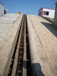 爬車機(jī)又稱高度補(bǔ)償器,是礦車自動(dòng)滑行線上為補(bǔ)償高度設(shè)置的設(shè)備。本公司開(kāi)發(fā)的板鏈?zhǔn)脚儡嚈C(jī)采用高強(qiáng)度板鏈作為傳動(dòng)鏈,液壓馬達(dá)驅(qū)動(dòng),具有結(jié)構(gòu)簡(jiǎn)單、強(qiáng)度大、傳動(dòng)平穩(wěn)、爬車能力強(qiáng)、維護(hù)方便等優(yōu)點(diǎn),特別適合爬車任務(wù)繁重、爬車坡度大的工況。