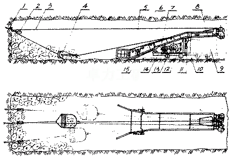 安裝使用示意圖↑1、固定楔 2、尾輪 3、鋼絲繩 4、耙斗 5、簸箕口 6、連接槽 7、中間槽 8、卸載槽 9、礦車(chē) 10、軌道 11、導(dǎo)向輪 12、操縱機(jī)構(gòu) 13、絞車(chē) 14、臺(tái)車(chē) 15、升降裝置 |
