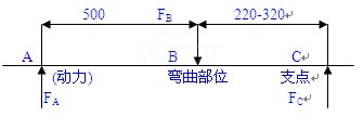 工作原理:本機體的一端為柱塞泵式液壓系統(tǒng),另一端為活動頂頭11,中間設(shè)有鎖緊鉤梁13。工作時將機具放在需要校直(彎曲)的鋼軌上部。機具中部的鉤梁對準(zhǔn)校直點,用直梁支桿12將機身支穩(wěn),然后往復(fù)擺動操縱桿,使柱塞泵1連續(xù)工作(吸、壓油),將高壓油壓入工作油缸2內(nèi),使活塞桿3外伸,油缸頂頭8在鋼軌左端A點處產(chǎn)生一推動力FA,再通過活動頂頭11在鋼軌右端C點處產(chǎn)生一約束反力FC,同時,中間鉤梁頂頭15,在鋼軌將要調(diào)直(彎曲)的部位B點處,又產(chǎn)生一約束反力FB(彎曲力),這樣根據(jù)杠桿平衡原理(三平行力平衡)可實現(xiàn)鋼軌的調(diào)直或彎曲。如圖示: