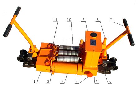 主要結(jié)構(gòu)如圖:1前夾具體、2活塞桿、3油缸、4回油閥(另一側(cè)為備用回油閥)、5后夾具體、6斜鐵(6塊)、7扳把、8油泵搖桿、9油箱、10復(fù)位彈簧、11小安全銷(2個)。㈡工作原理:增大軌縫時,使用前夾具體1與后夾具體5,通過四個柱塞泵將液壓油壓入雙油缸中,活塞2向外伸出,前、后夾具體中的斜鐵夾住兩條鋼軌后,推動鋼軌使兩條鋼軌間的縫隙增大,從而達(dá)到調(diào)整軌縫的目的。四、使用方法和保養(yǎng)正確的使用與保養(yǎng),對保證機(jī)具的正常工作和延長其使用壽命具有重要作用,操作者應(yīng)認(rèn)真閱讀本說明書,以了解各部結(jié)構(gòu)和作用。㈠、使用前檢查1、油箱內(nèi)油面高度是否達(dá)到油箱高度的2/3,夏季使用40#機(jī)油,冬季使用20#機(jī)油,加油時應(yīng)過濾。2、操縱部分是否靈活可靠。3、回油閥啟閉是否正常,各液壓件工作是否正常。4、各連接緊固部位是否松動和有無漏油現(xiàn)象。㈡、操作步驟1、將機(jī)具置于被調(diào)整的兩根鋼軌接頭處,使軌縫位于前夾具體1與后夾具體5之間。2、向下搬動夾具體上的操縱扳把7使夾具體落在鋼軌上。3、順時針旋緊回油閥4,用操縱桿搖動油泵搖桿8,使液壓油輸入工作油缸3中,當(dāng)活塞2伸長20mm后,斜鐵則可夾住鋼軌,繼續(xù)搖動操縱桿即能達(dá)到調(diào)整軌縫作業(yè)目的。4、每次軌縫調(diào)整完畢應(yīng)按逆時針方向先旋開回油閥,然后向上搬動扳把7松開斜鐵,使工作油缸活塞在拉簧作用下復(fù)位,即完成一次工作循環(huán)。(本機(jī)設(shè)有兩個回油閥,當(dāng)其中一個出故障時,打開另一個回油閥,即可使油缸復(fù)位,提高了本機(jī)的安全性能。)5、完成作業(yè)后,向上搬動各夾具體上的扳把7,通過棘爪將走行輪落在鋼軌面上,推行至下一軌縫處或整機(jī)下道。6、油箱內(nèi)設(shè)有溢流閥,其壓力在出廠前已調(diào)整至52MPa,當(dāng)負(fù)載過大時,溢流閥卸荷,從而保證機(jī)具使用安全。㈢故障排除