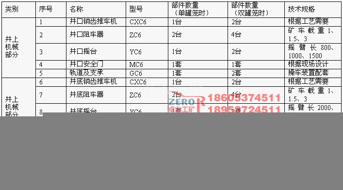 下表給出了在單罐籠提升和雙罐籠提升兩種情況下,井口和井底車場(chǎng)所用銷齒操車設(shè)備的組成明細(xì):